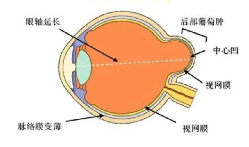高度近视的定义通常是指近视度数超过-6D(600度)。但6岁以下儿童如果近视超过-4D(400度)、8岁以下儿童近视超过-5D(500度)也被称为高度近视。常表现为眼轴延长,在眼轴不断增长的过程中,眼球壁各层向后扩张形成葡萄肿,从而导致玻璃体混浊、液化,视网膜、脉络膜萎缩,视网膜裂孔,黄斑变性等一系列病理改变,造成视功能严重损害,甚至失明。